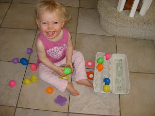 As we are working on identifying colors, we are also focusing on sorting/matching colors. Mia loved opening the eggs and finding the surprise inside. This kept her attention for quite awhile