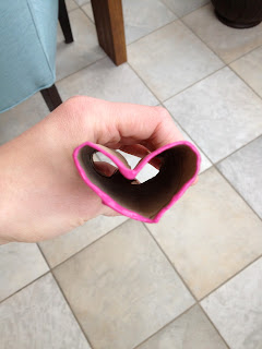 We made a heart stamper out of a toilet paper roll. This is a great project for young toddlers since the toilet paper roll is so easy to hold.